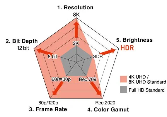要了解HDR的重要性要從視頻質(zhì)量的五要素說(shuō)起, 這五個(gè)要素共同決定電視能呈現的內容和現實(shí)情況(或導演想要的)的程度,從SDR到HDR這五個(gè)要素都**提升: